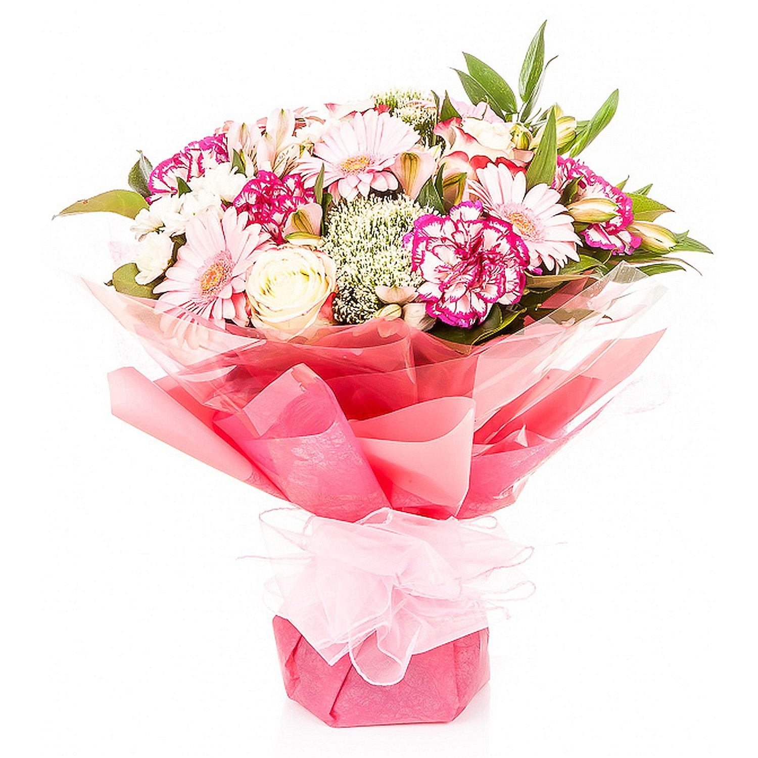 Standard Roses, Mini Gerberas, Santini Chrysanthemums, Gypsophila, Alstroemerias, Carnations & Decorative greenery (14 stems)